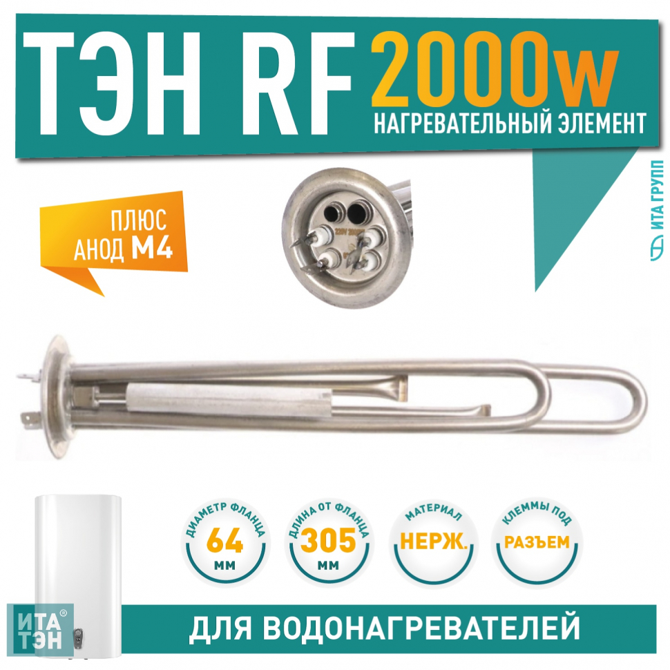 Комплект ТЭН 2 кВт (2000 Вт) RF для водонагревателя Thermex RZL, IS, IR, Garanterm, Electrolux EWH, нерж. + анод М4, 30082