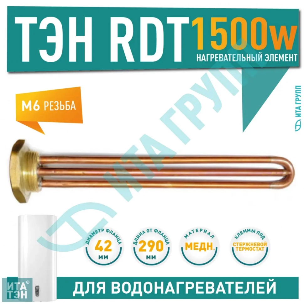 ТЭН 1,5кВт (1500Вт) RDT, резьбовой 42 мм для Ariston, De Luxe, Real, Thermex, под анод М6, 30291